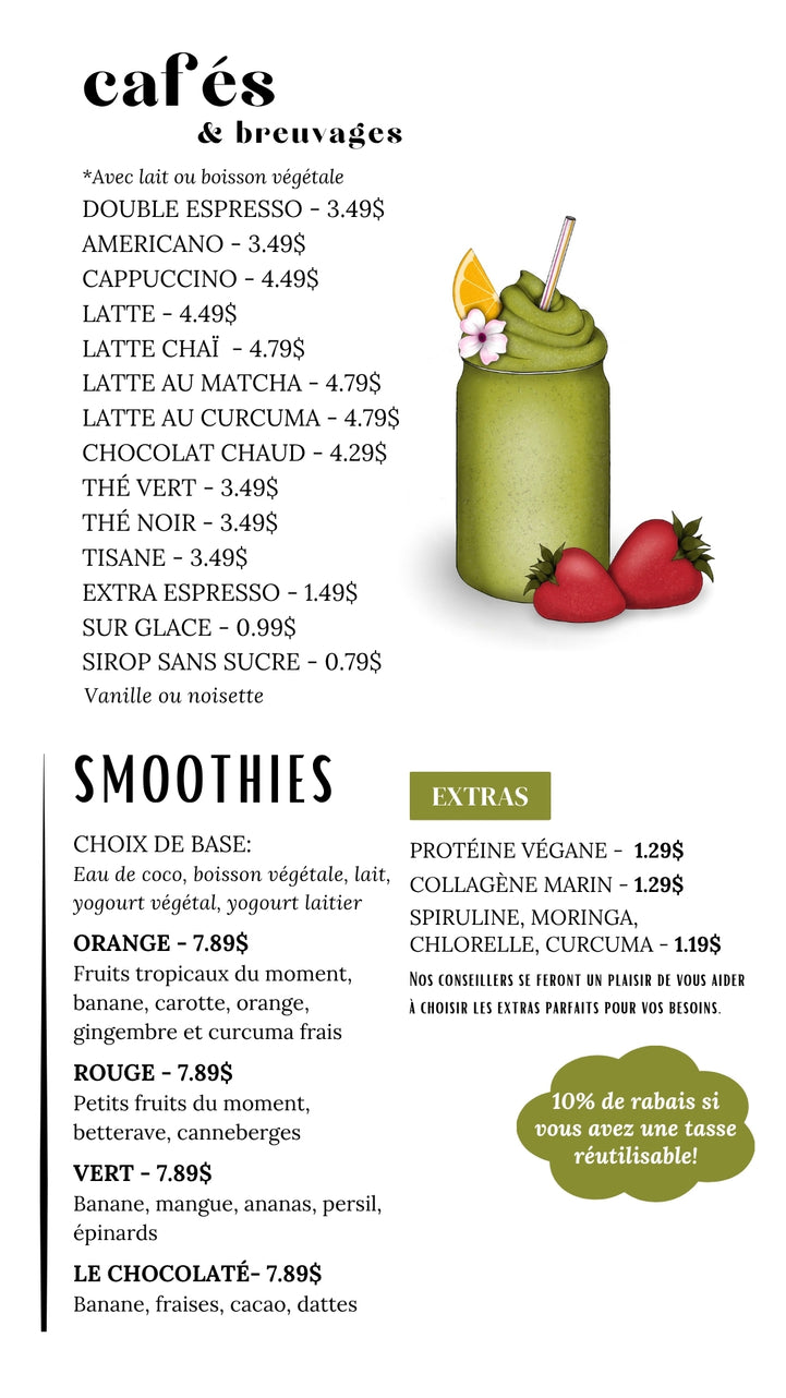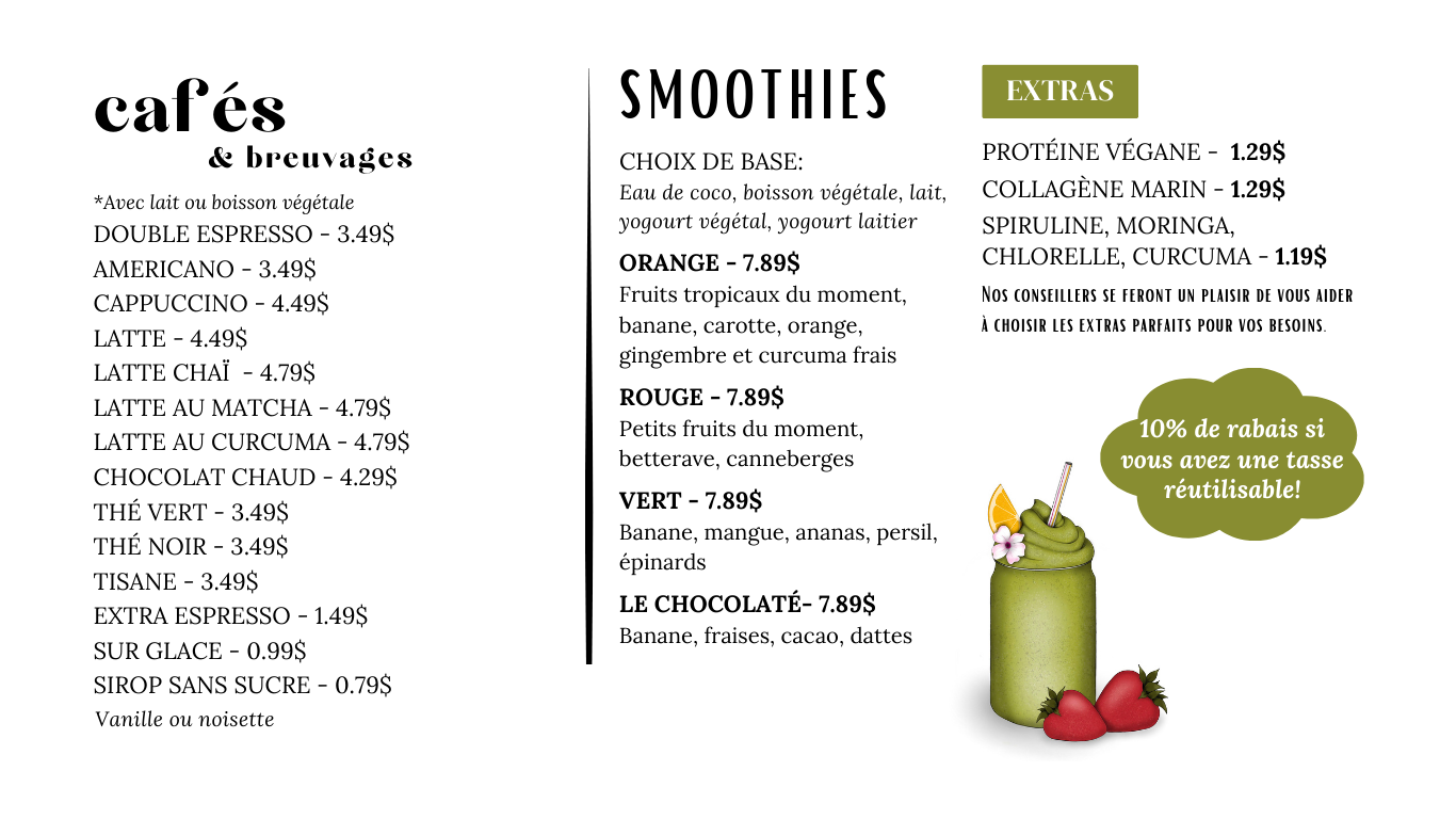 Que vous ayez envie d’un repas équilibré, d’un café réconfortant, d’une viennoiserie ou d’un smoothie rafraîchissant, notre bistro est l’endroit idéal pour une pause gourmande.