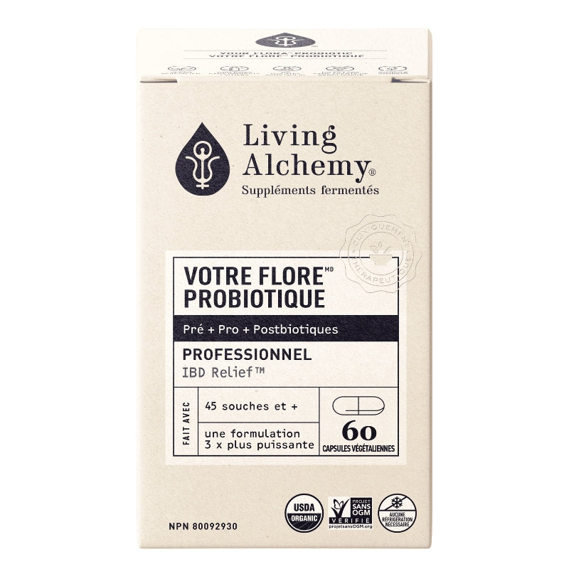 Notre formule Your Flora® Professional est le fruit de nombreuses années de recherche utilisant notre procédé de fermentation kéfir-kombucha à souches variées. Cette formule est un symbiotique cliniquement thérapeutique contenant 400 mg de soja biologique fermenté sans OGM pour une meilleure survie microbienne et une colonisation supérieure.